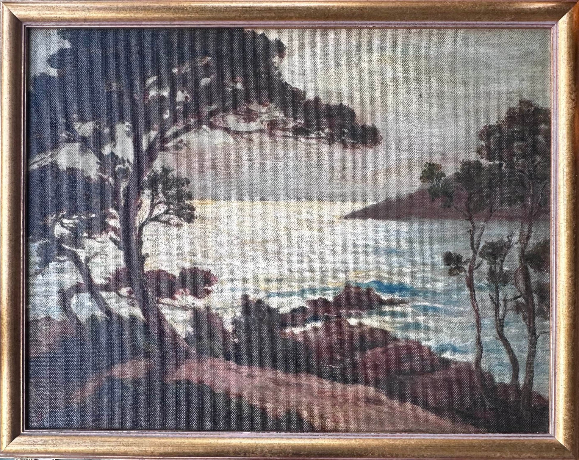 Pine trees silhouetted against a sparkling sea or lake. A rocky peninsula in the distance and a curved path to the sea in the foreground.