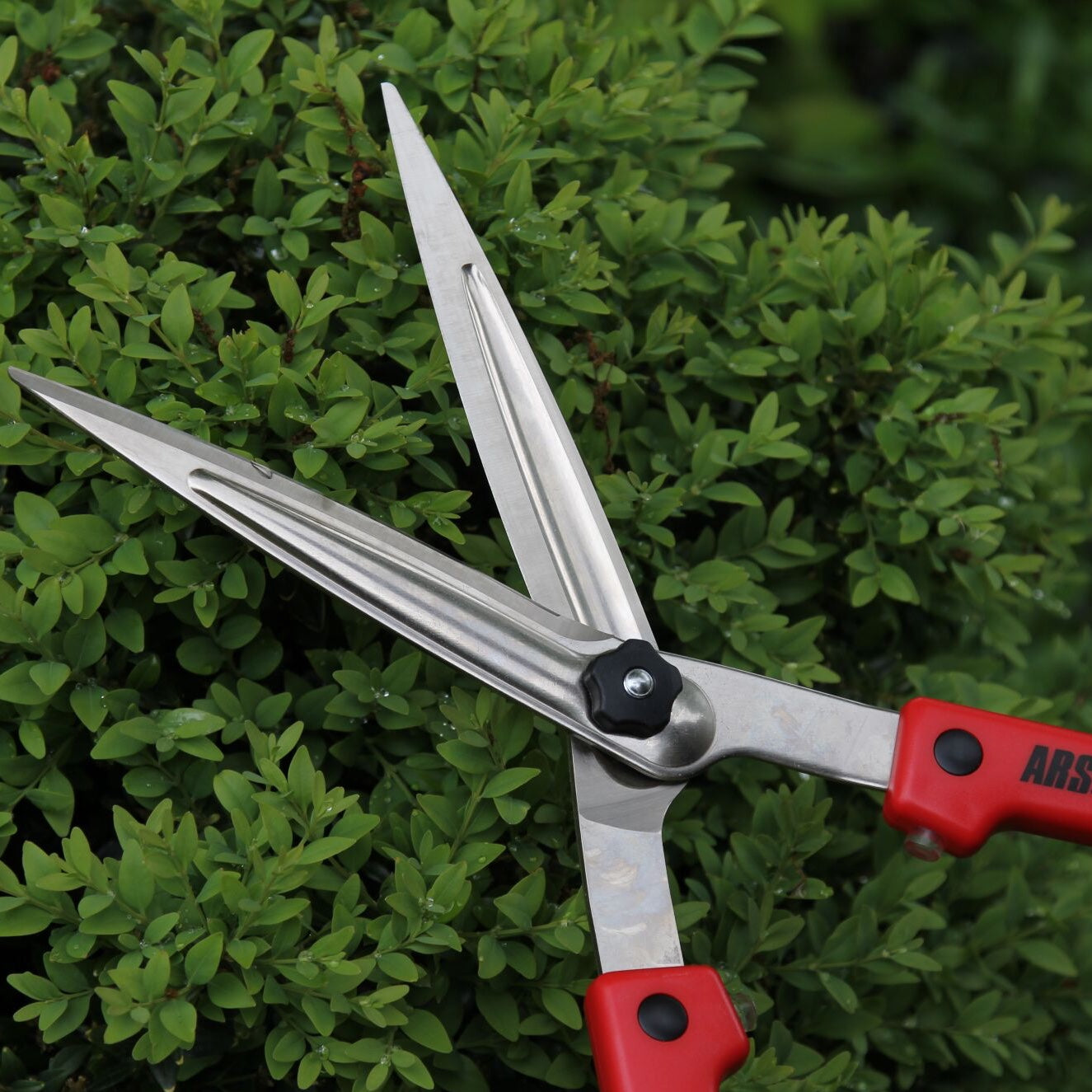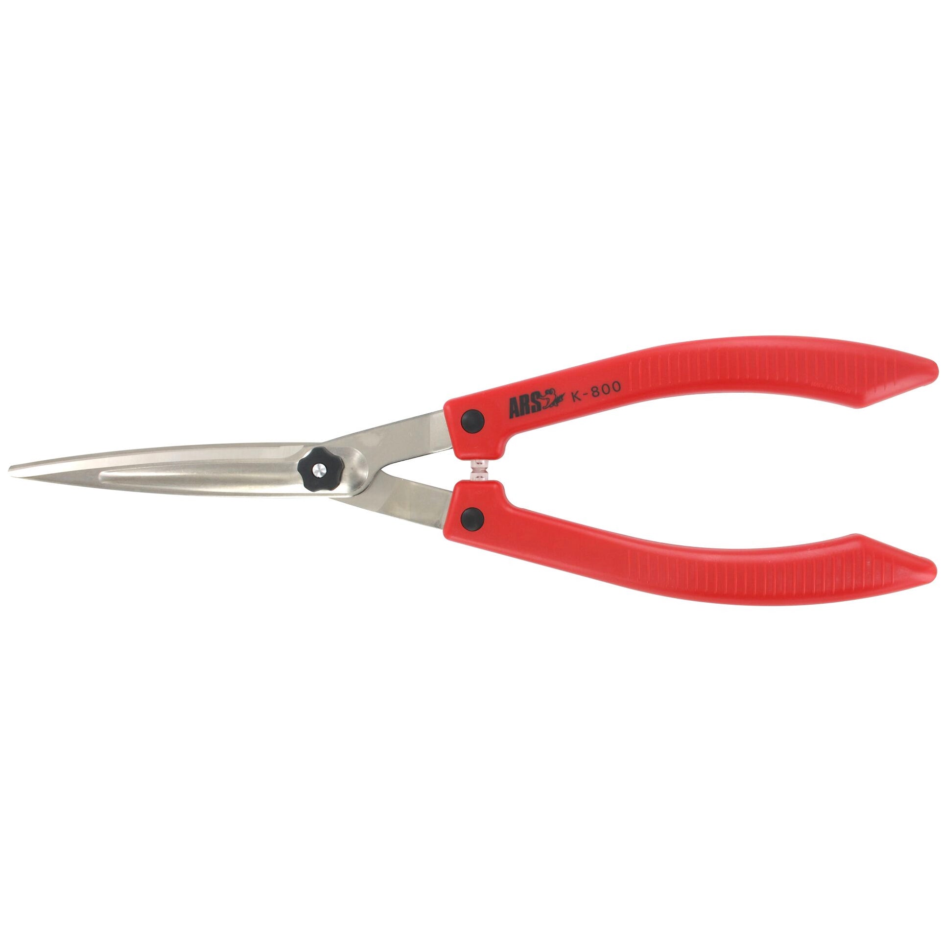 Made in Japan from strong, lightweight steel alloy with hard chrome steel blades. The slightly curved handles and blades provide an optimal cutting angle for pruning and cutting bushes and grass. Easily gripped red handles, shock-protection for prolonged use.