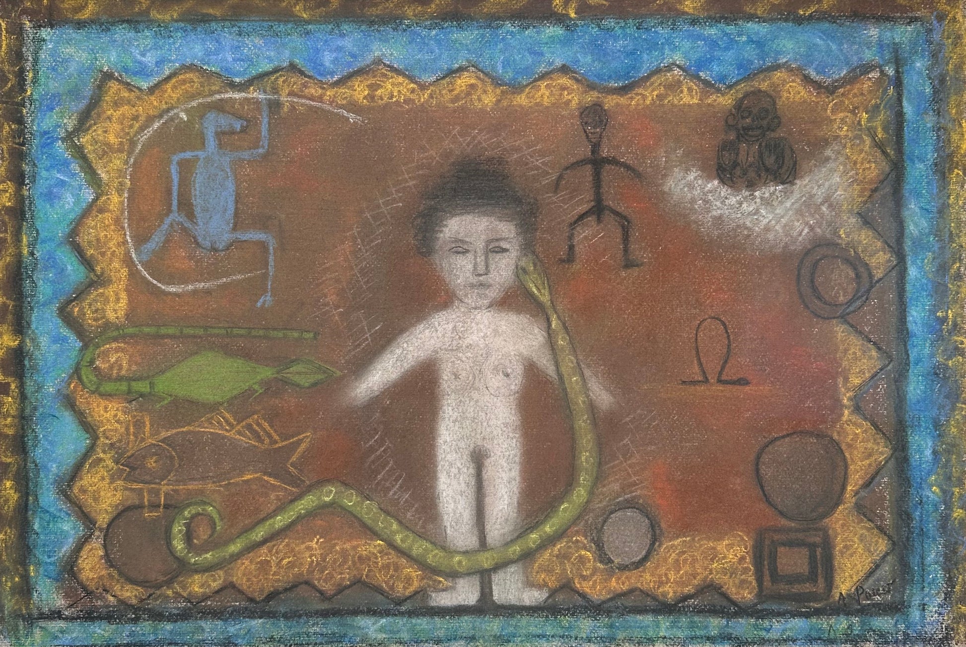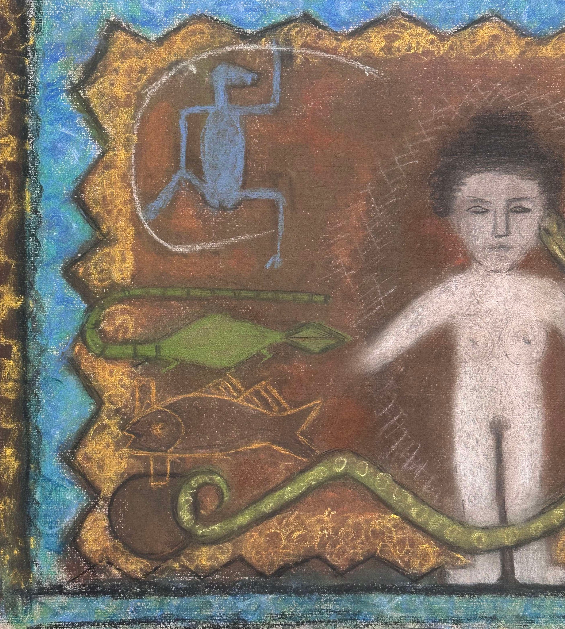 This striking work is full of religious ionography, in a Celtic-meets-South-American folk art style. It is one of the larger and more elaborate of his works that we have come across. His work was reviewed as being in a "faux-naïf" style with a "sharply etched focus" bordering on surrealism by the art critic Brian Fallon.