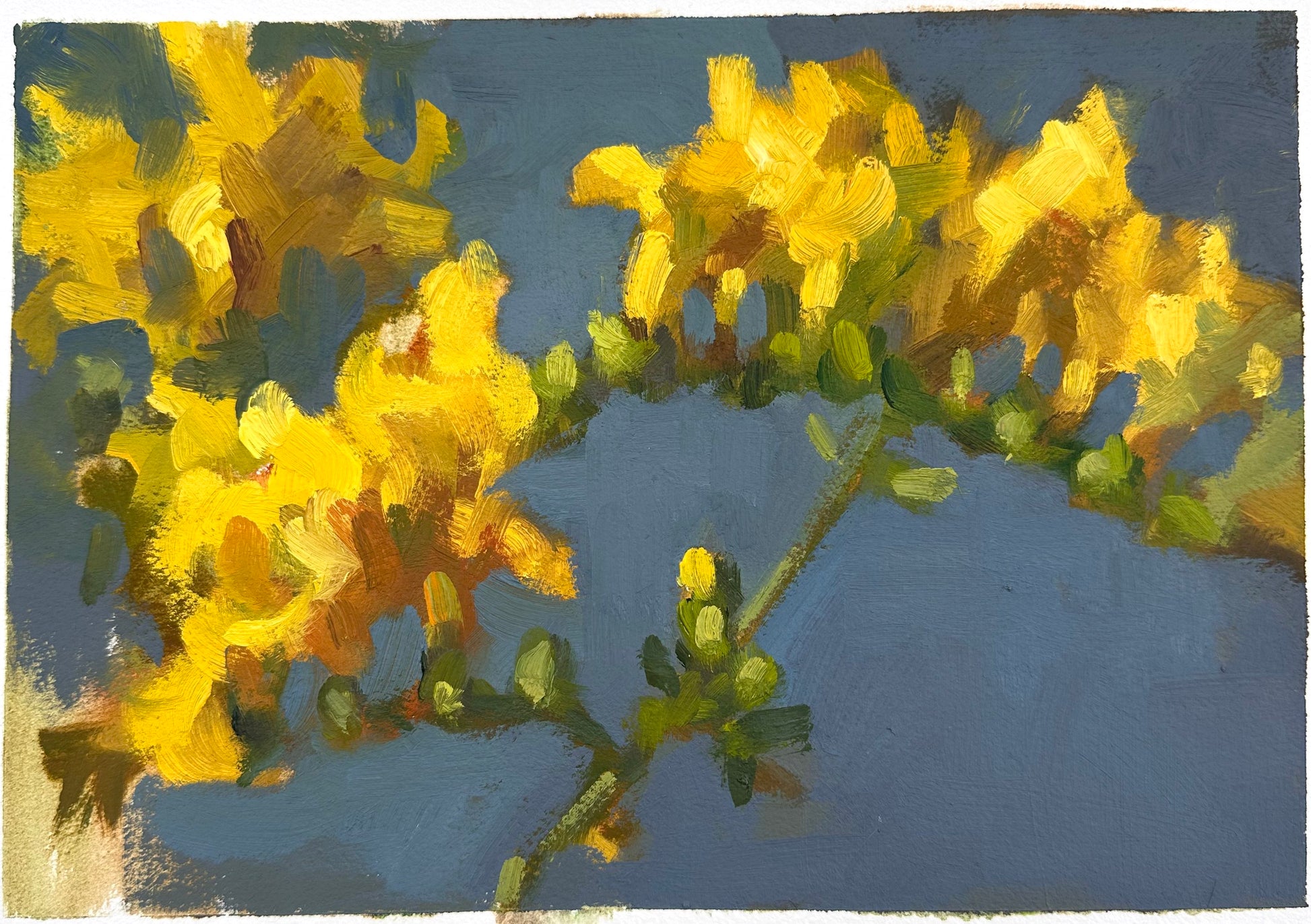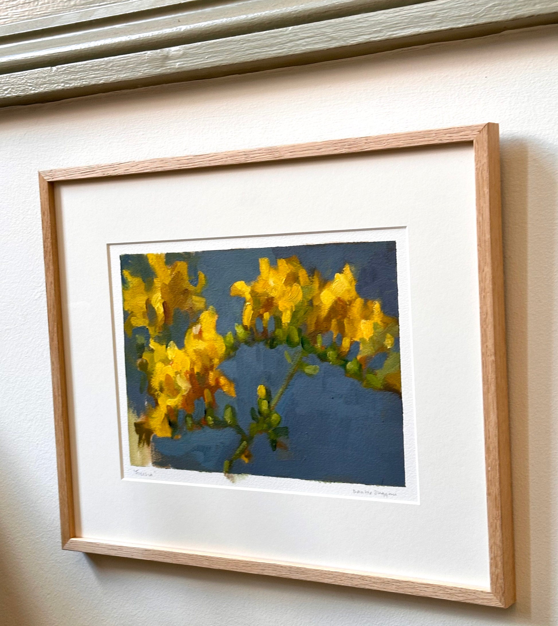 Yellow freesias with a vibrant blue-green background. A perfect companion to the other painting of hers in Clare Street, showing freesias picked and dropped into a glass vase. Bairbre is renowned for her still life paintings of flowers, as well landscapes and portraits.
