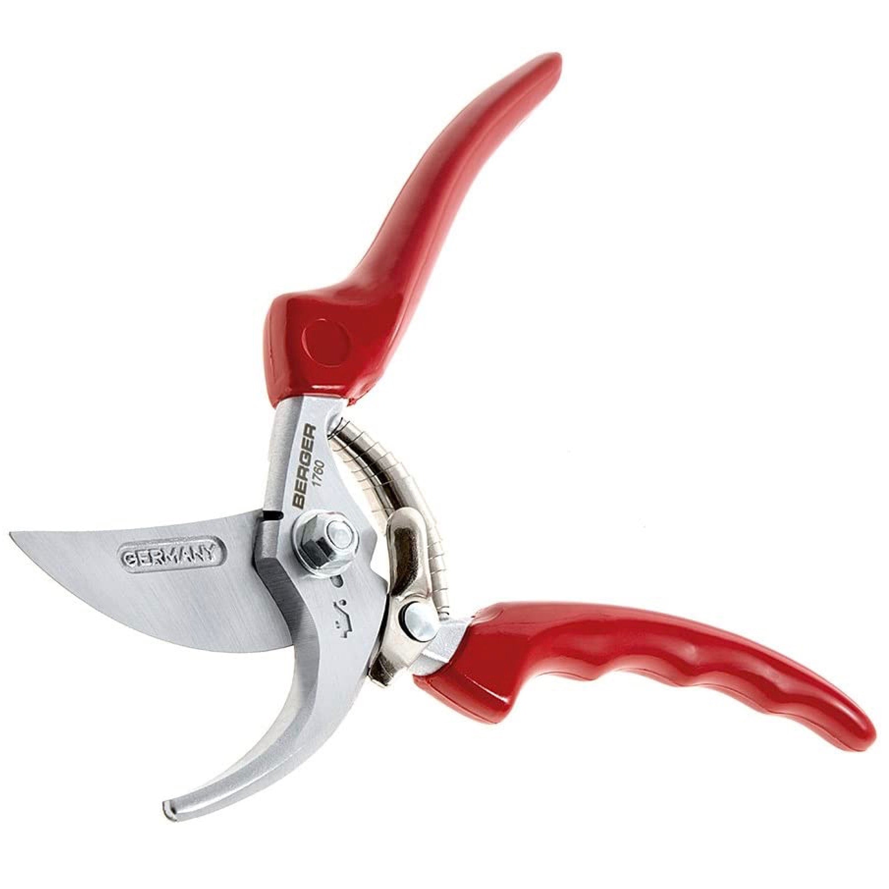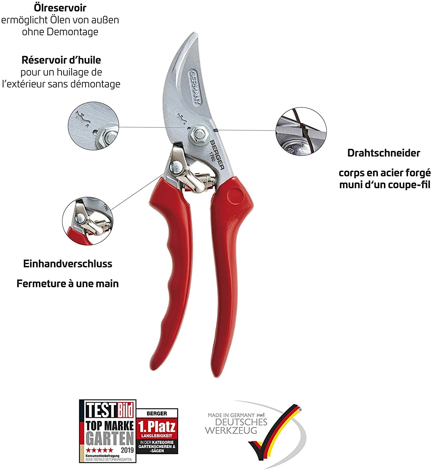 Excellent quality secateurs for day-to-day gardening. Made in Germany by Julius Berger. Chrome plated blades, corrosion protection, oil reservoir for easy lubrication, fully forged body, bypass cutting mechanism, comfortable non-slip red handles, wire trimming notch, thumb-lock mechanism. Designed for a long life and pleasurable use. Suitable for branches / stems up to 25mm. Total length 215mm