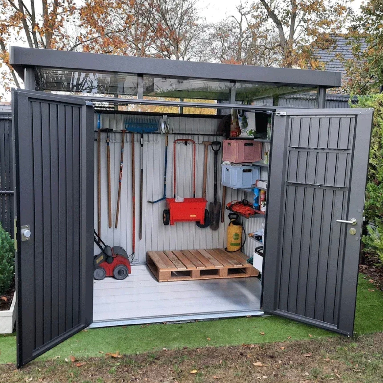 The HighLine from Biohort is a practical, stylish, robust garden building that is so stylish that it doesn't need to be hidden away. This shed is metallic dark grey with double doors. It includes an aluminium floor frame and galvanised steel floor panels, meaning that is ready to be situated on any firm level surface such as gravel, paving, concrete etc.