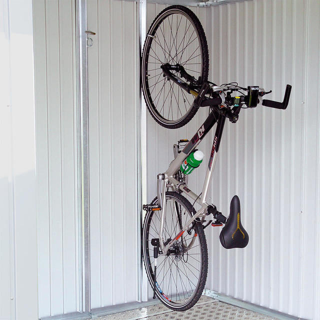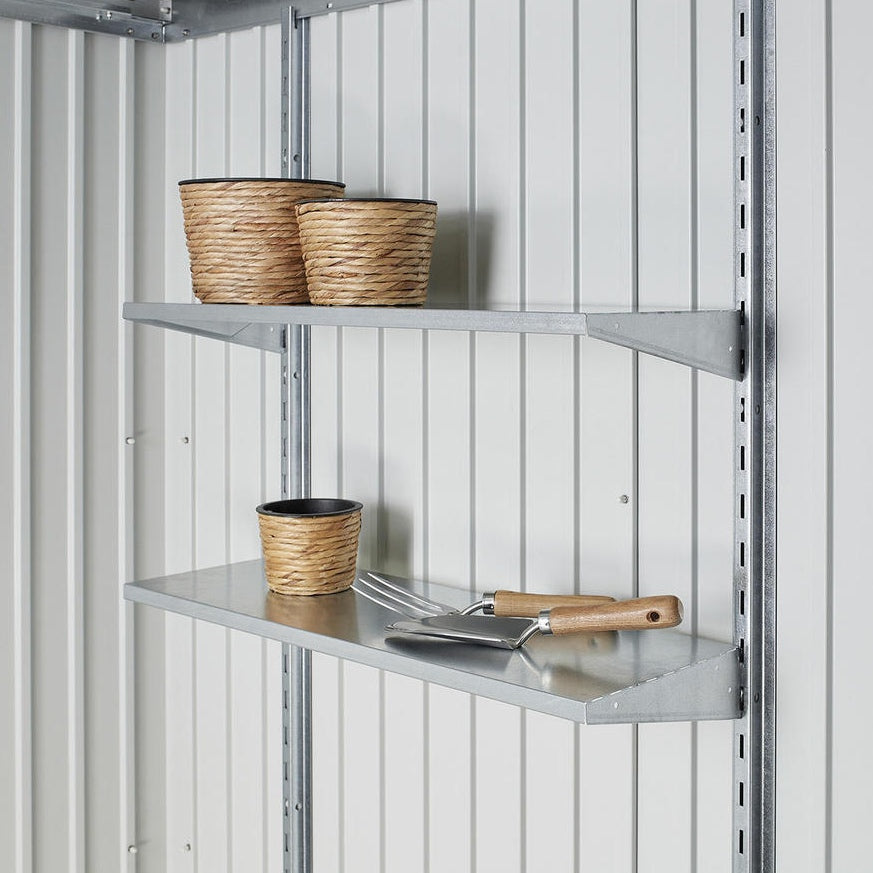 Made in Austria to high specifications and excellent design. The panels are made from hot-dipped galvanised, polyester-coated steel with a 20 year manufacturer's guarantee. Hinges and screws are high-grade stainless steel, and the cylinder lock provides good security. Doors close and open on a gas-spring mechanism. The shed includes a shelf set (2 shelves with support rails), basic tool racks (6 tool hangers) and an integrated roof gutter.