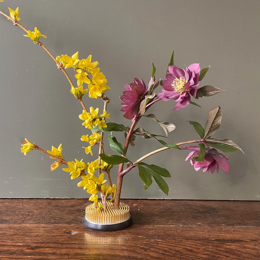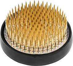 Medium kenzan ('flower frog') used for flower arranging or Ikebana flower displays. A good alternative to oasis - waste free and endlessly reusable. Simply push a twig or flower stem into or between the brass spikes. Immerse in water in a vase or dish. Made by Niwaki in Japan, 257g. 80mm diameter.
