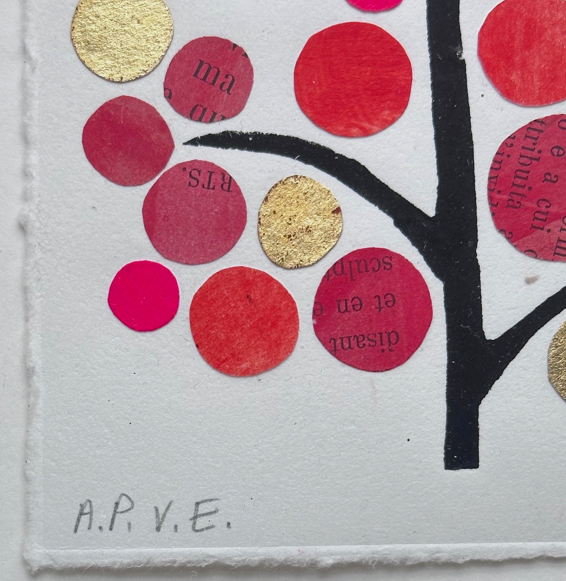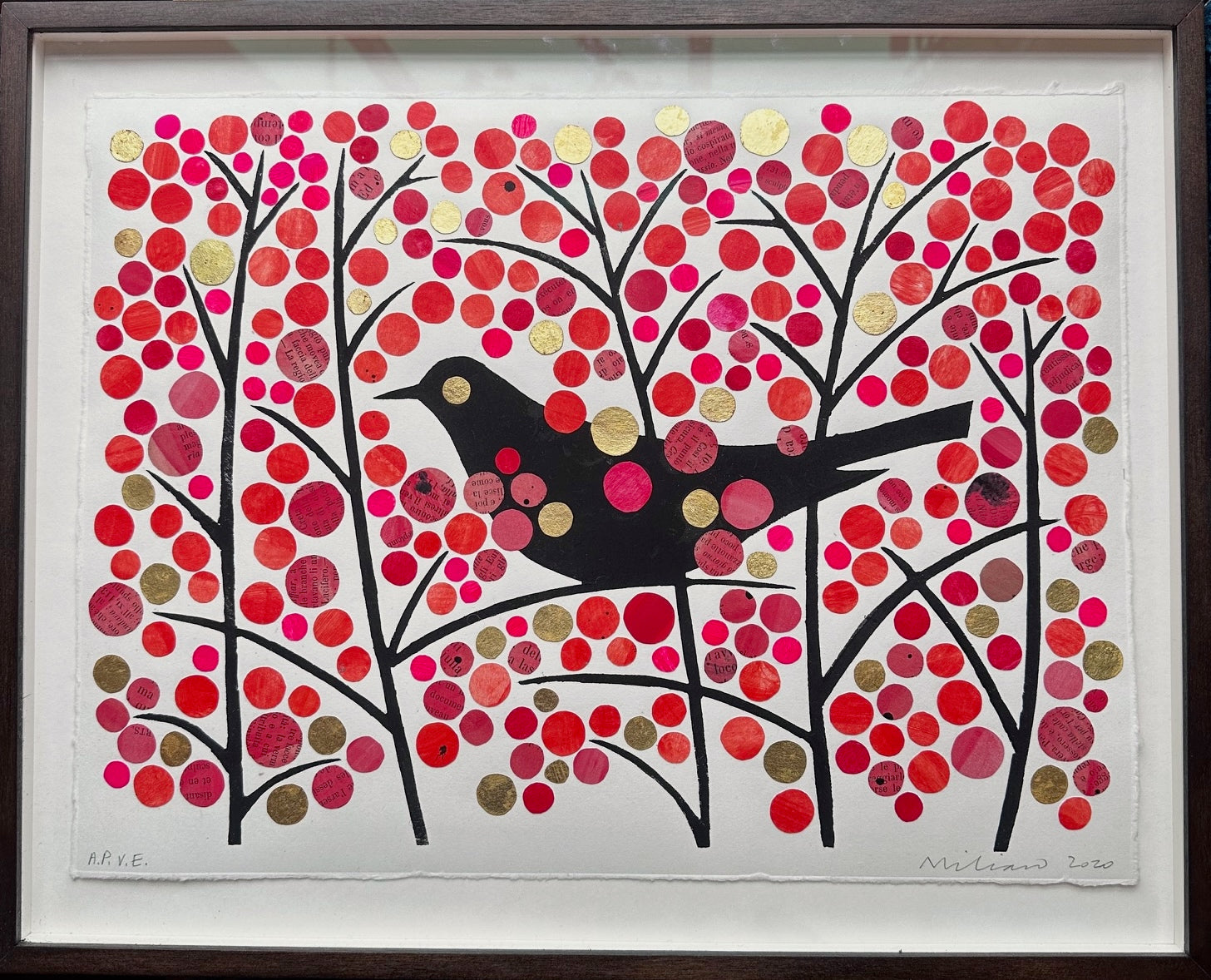 26 x 34cm, excluding frame. Float mounted and framed with archival mount and backing board, UV protecting and low reflection glass. Japanese water-based woodcut (Mokuhanga) on Bunkoshi antique paper. with gold leaf and collage. Edition: Artist's Proof. Signed and dated bottom right.