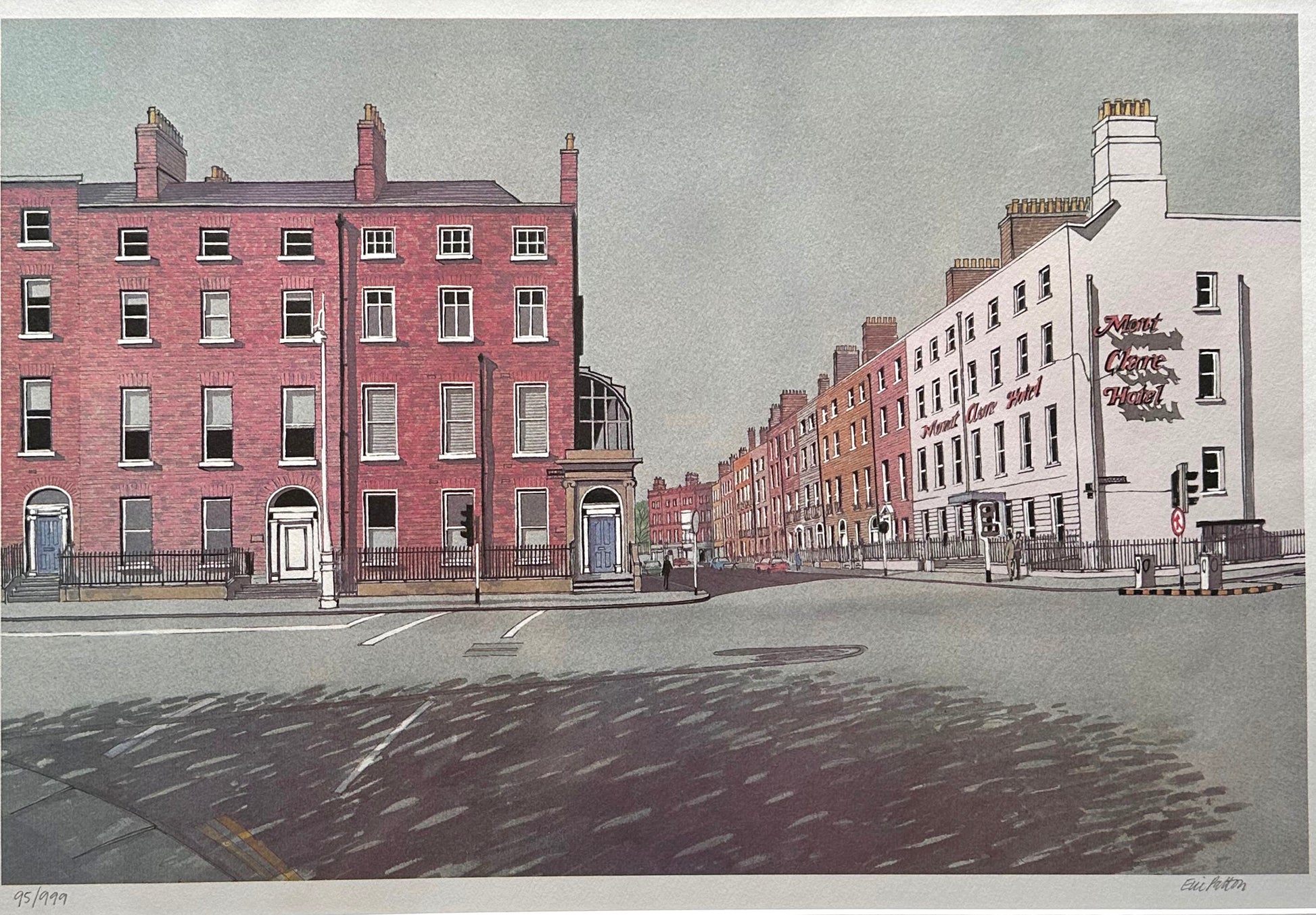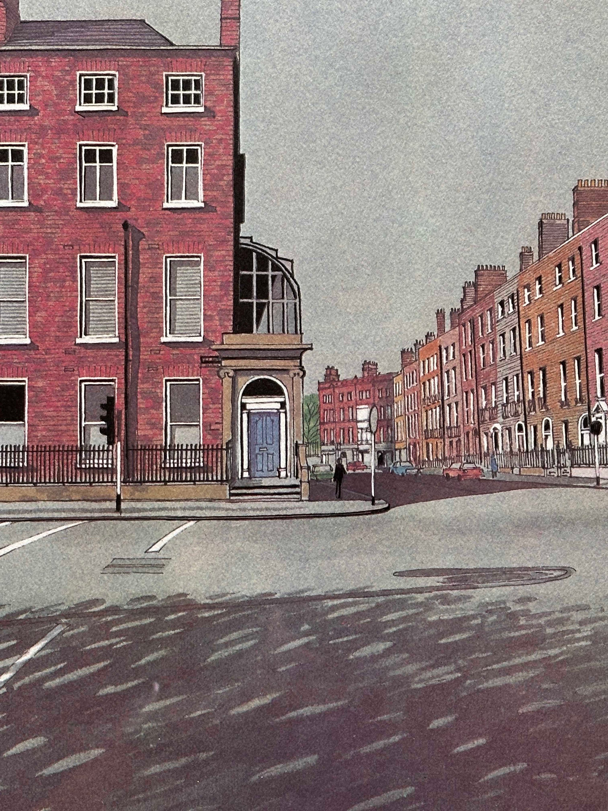 Eric Patton R.H.A. worked in oil, watercolour and as a printmaker. His views of Georgian Dublin, made in the early 1980s, show an unsentimental, uncluttered version of Dublin. Notable for their attention to architectural detail, the period street furniture and vehicles, as well as the subtle colouring and perspectival skill, the lithographs document Dublin at a very particular time. He exhibited with the Royal Hibernian Academy