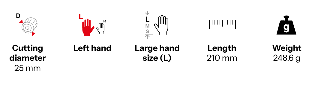 Most parts are replaceable. Red handles make them difficult to lose, and provide warmth and grip. Cutting width up to 25mm. Total length 19.5cm. Weight 210g