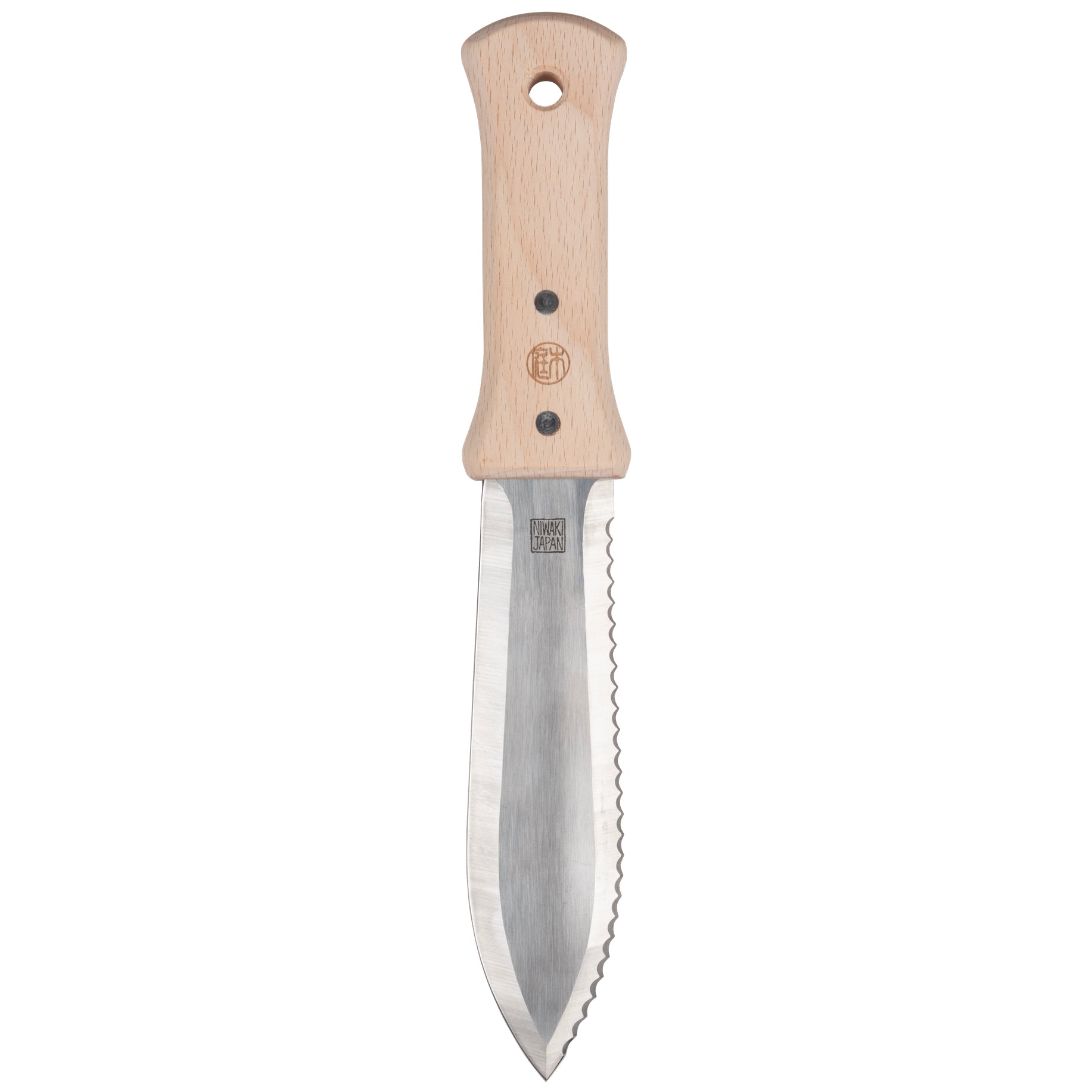 Finely crafted in Japan from carbon steel, with a beech wood handle. Known as a 'Hori Hori', it has sharp edges, a slightle scooped profile and serrated on one side. It can be used for weeding, bulb planting and transplanting. Wash and dry after use, and rub with an oil such as camellia oil from time to time. Do not use it as a crowbar - carbon steel can snap!