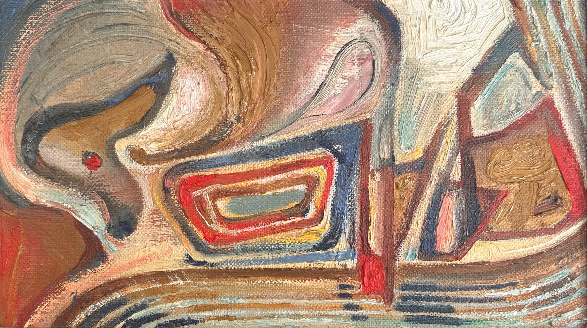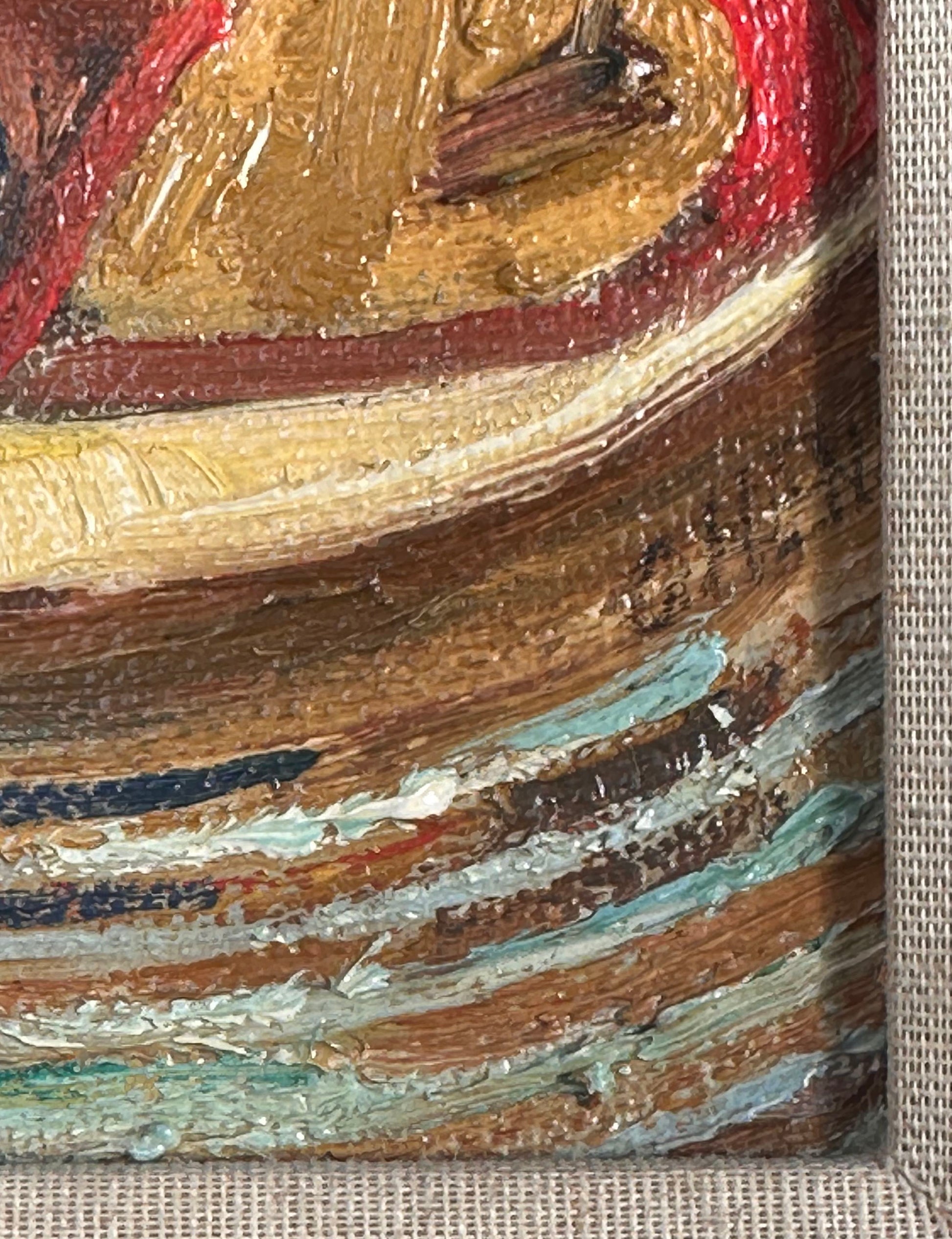 This small painting (a dog curled up amongst colourful rugs) most likely dates from the 1940s. Oil on board. Original lime-washed oak frame with linen trim. Image size, 28 x 15cm