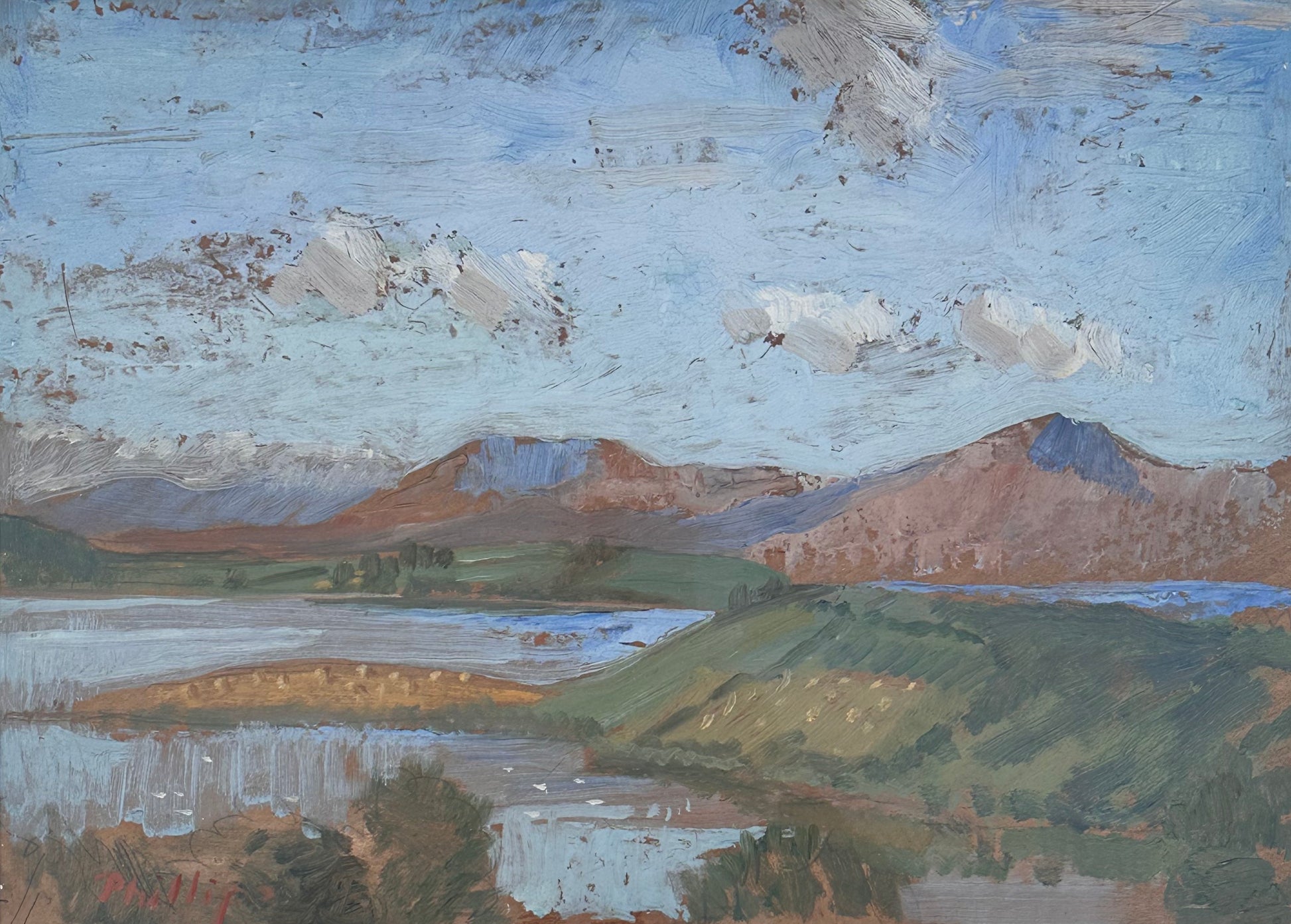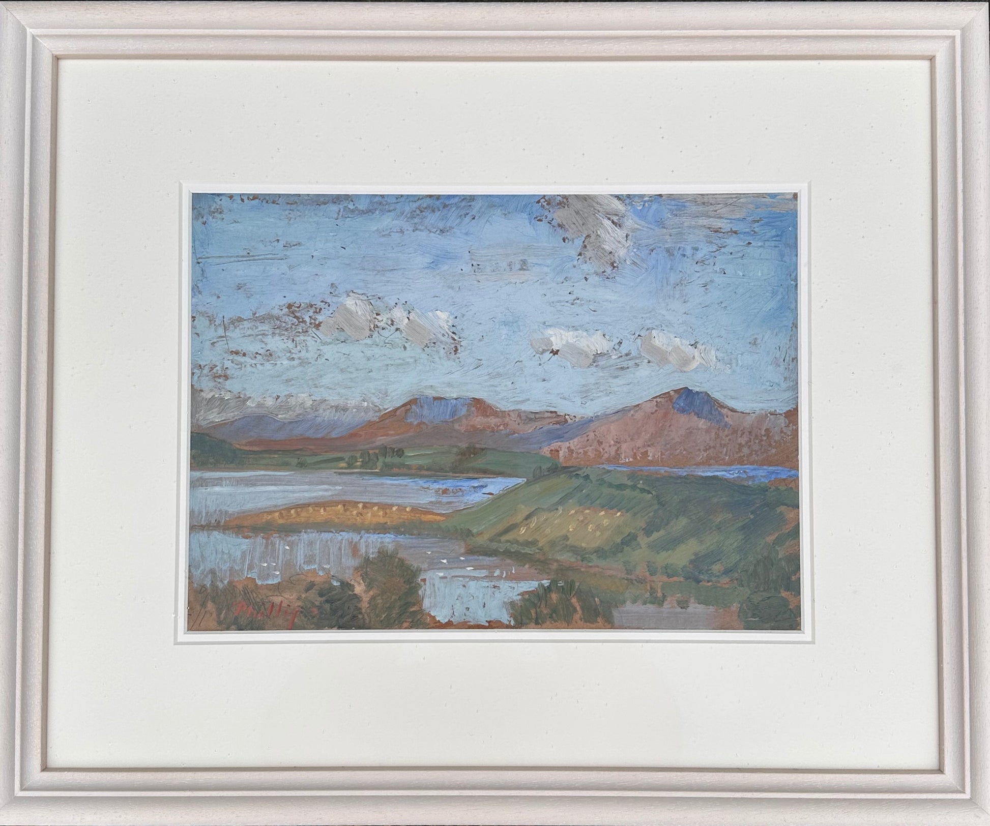 Patrick Phillips was an English landscape and portrait painter. He was also a teacher and later principal, at the Byam Shaw art school. He exhibited at the Royal Academy, amongst other places. The Tate Gallery holds one of his portrait paintings. This painting of Bantry Bay captures the light and landscape of West Cork in the South West of Ireland. Haystacks dot the fields and clouds scud across the sky.