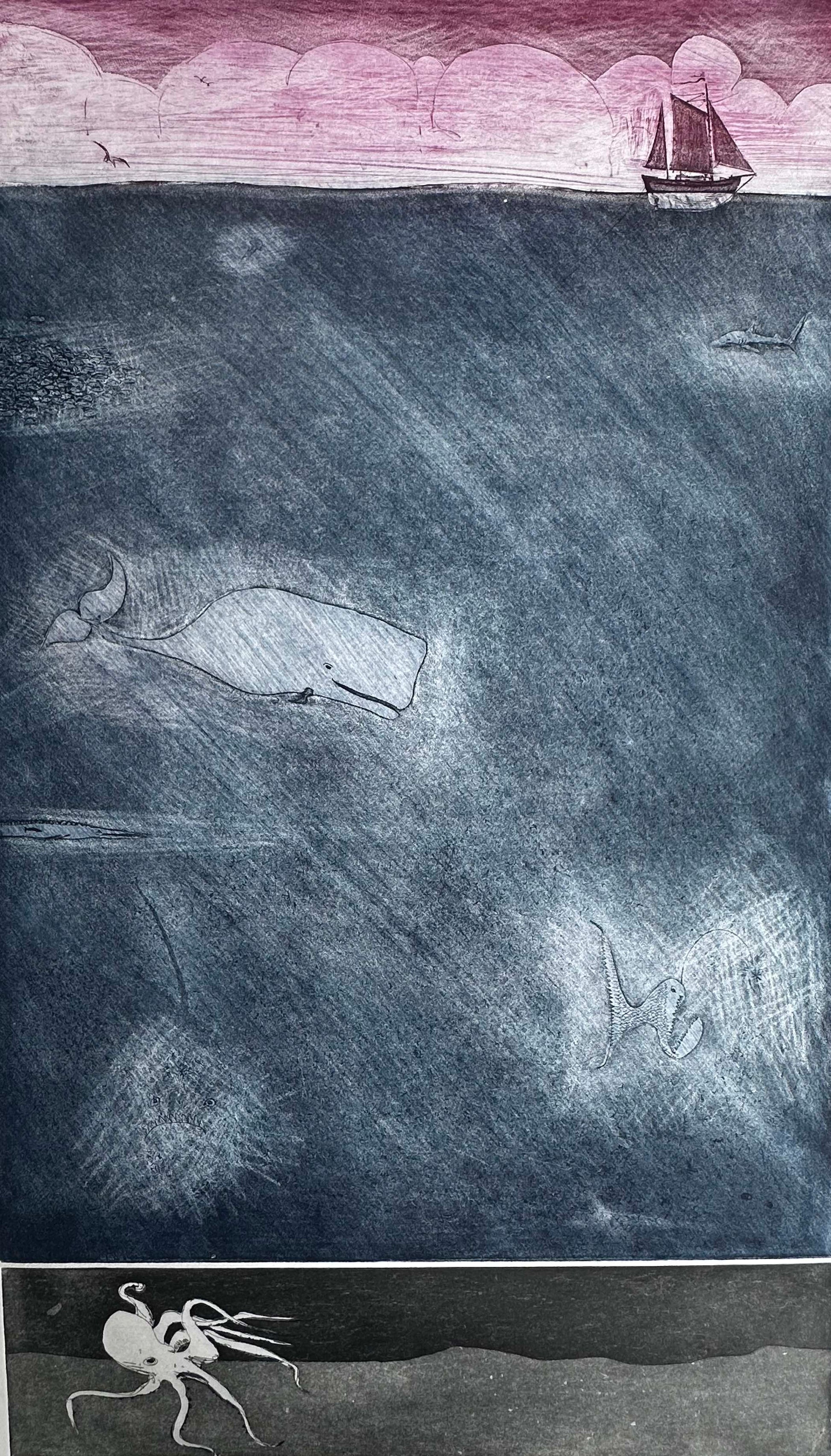 One of Pete Hogan's most characterful and intruiging pieces, 'The Deep' is a complicated feat of etching that combines multiple plates, creating a multi-layered 'story'. From top to bottom, different characters and creatures inter-relate. Made in the 1980s and newly framed by us, this is a unique 'Artists's Proof' etching.