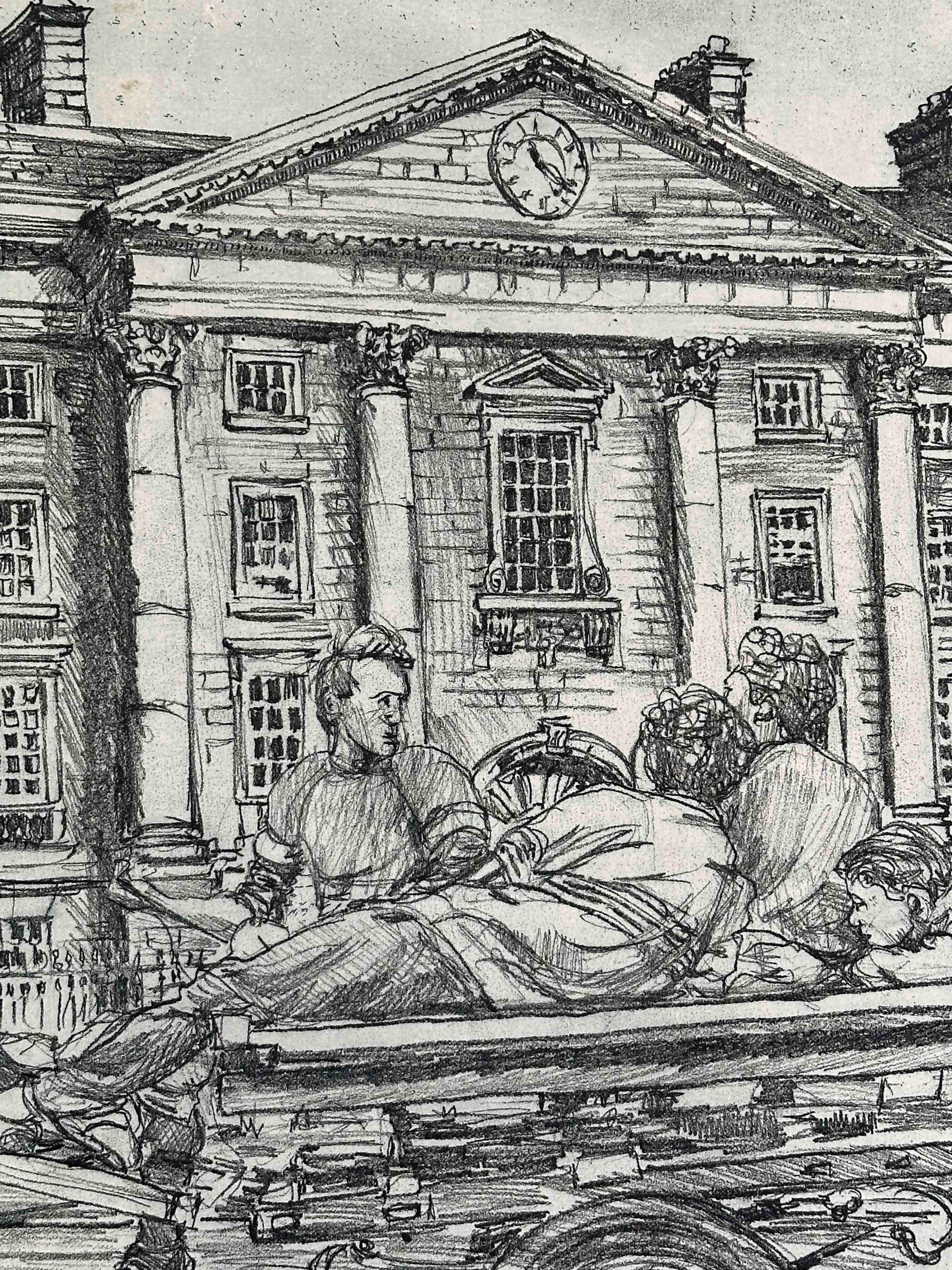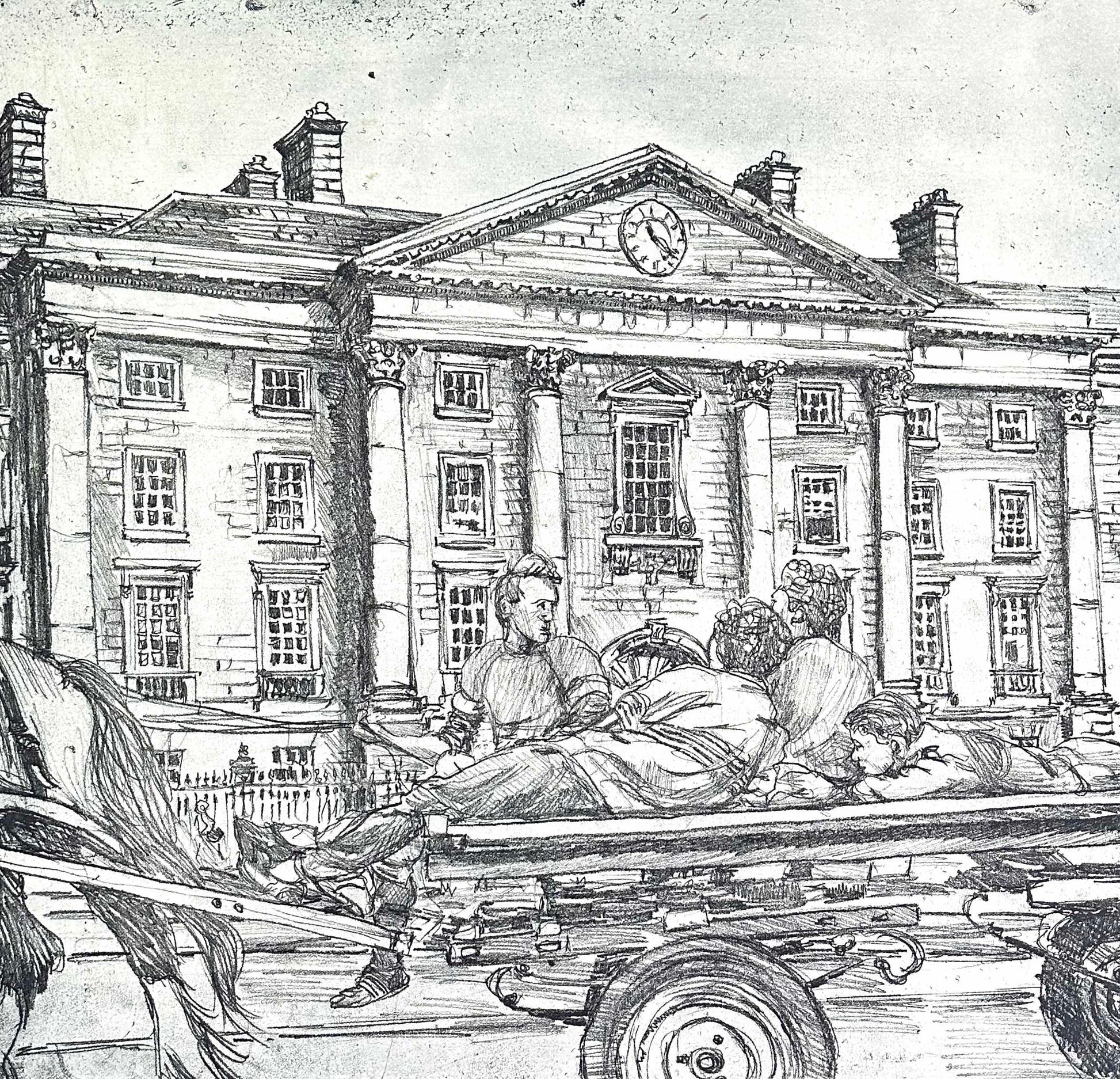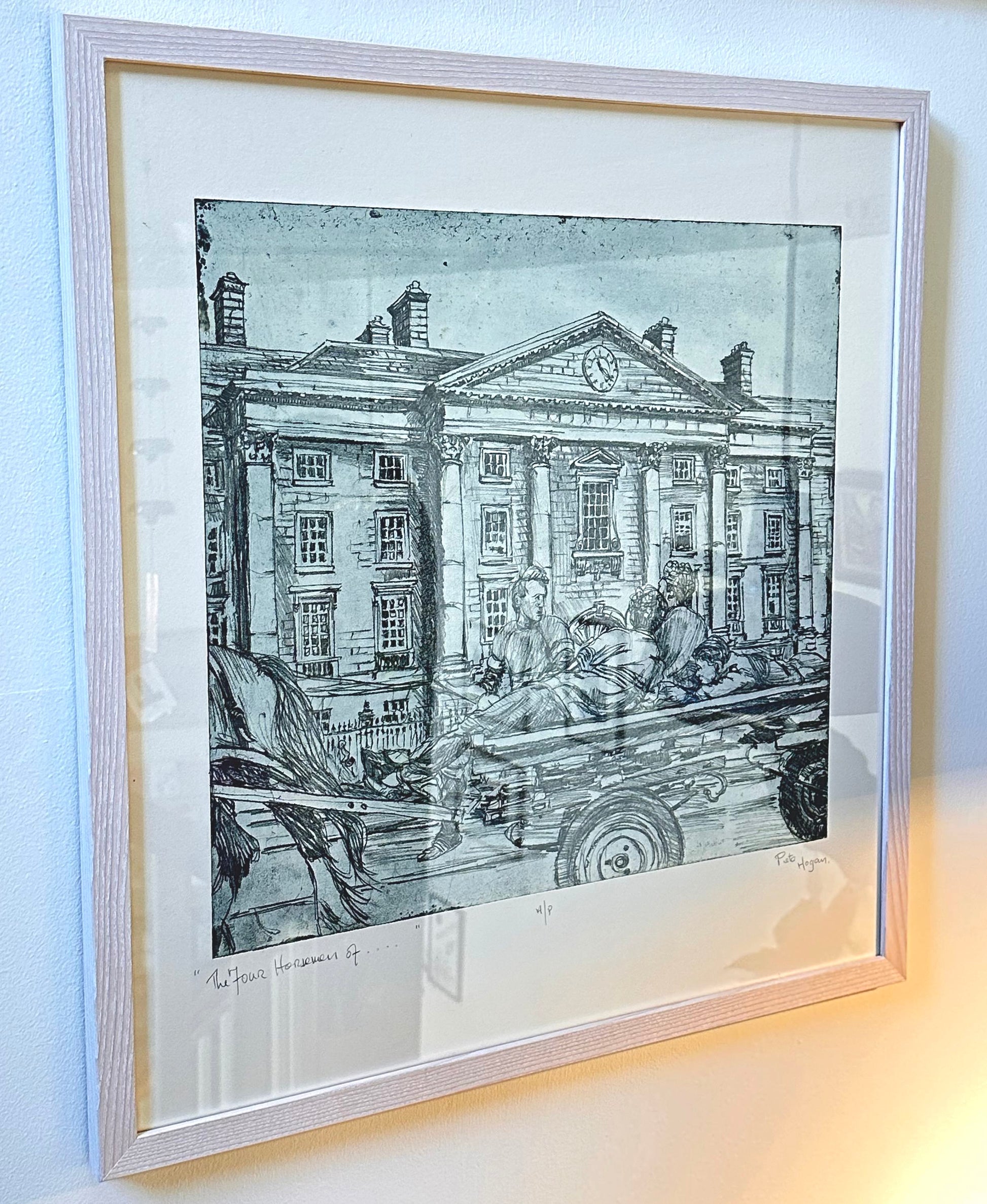Made in the 1980s, this complex and detailed etching shows four men going past the front of Trinity College on a horse-drawn cart. Rich in architectural detail and also an excellent portrait study of the four men in movement.