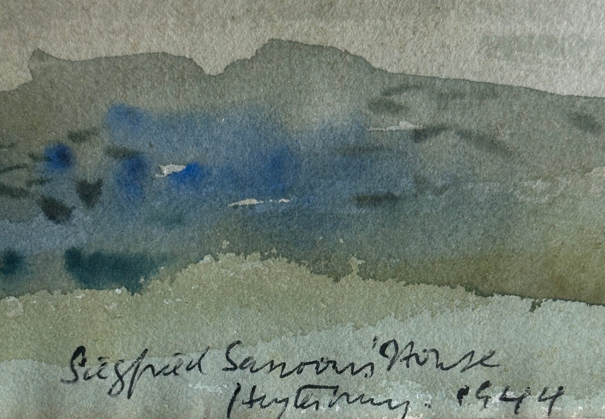 Watercolour landscape depicting a pastoral landscape and large country house. Horses graze beneath mature trees, autumnal colours prevail.Signed and titled bottom right. Interestingly, this is the home of the soldier and poet Siegfried Sassoon, a place frquented by other literary types such as E.M. Forster.