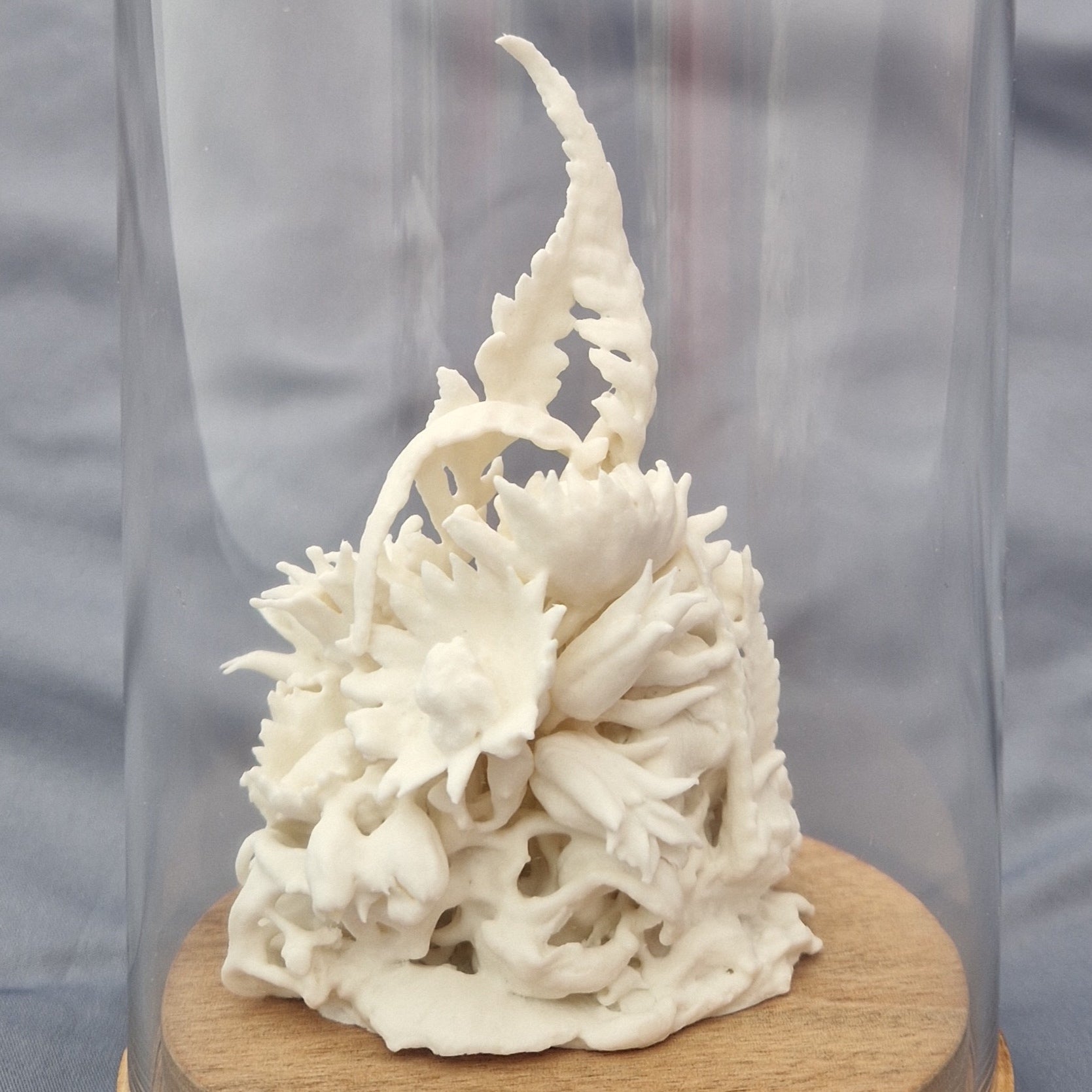 Vicki Sutherland is a ceramic artist based in Dublin. She created the delicate porcelain 'Flora' series as a response to similar Victorian pieces known as Memento Mori (from the Latin, meaning 'remember you must die'). Her sculptures, normally displayed under glass, are also inspired by 17th century Dutch floral still life paintings in which petals or fruit show signs of decay. She aims to remind the viewer of the fragility of nature and the earth's vulnerability. She is also fascinated by plant fossils, which in a way her pieces echo.